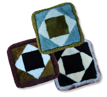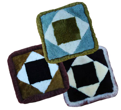 flauschig geschorenes Lammfellkissen im Patchwourkdesign,